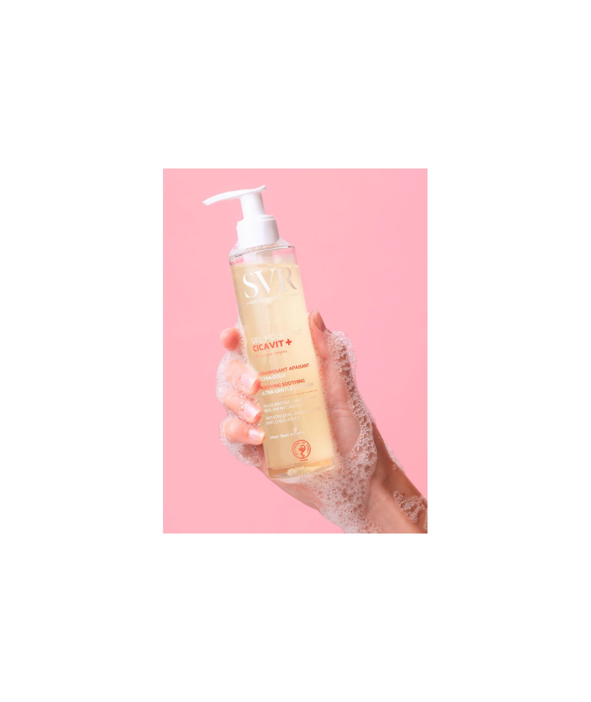 SVR CICAVIT+ Gel Moussant Apaisant nettoie les zones cutanées irritées des zones fragilisées. tout en respectant l'équilibre du film hydrolipidique de la peau en respectant ses défenses naturelles, et en limitant les agressions extérieures qui peuvent l'endommager.