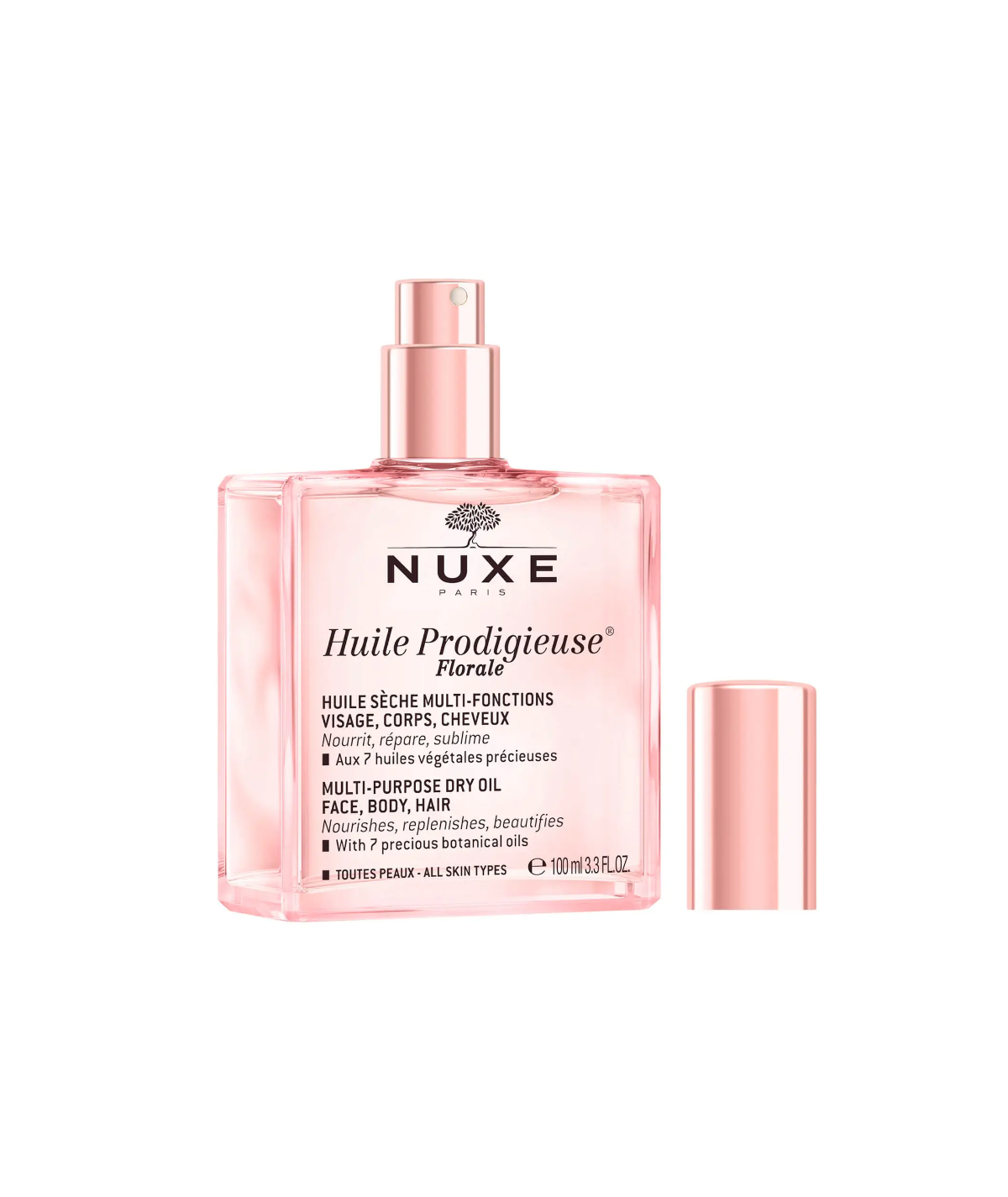 NUXE HUILE PRODIGIEUSE FLORALE aux 7 huiles précieuses 100% végétales se décline dans un nouveau parfum floral et délicat. Cette huile hydratante conserve la même texture huile sèche et la même efficacité sur le corps, le visage et les cheveux. Son action anti-oxydante, son effet "bouclier anti-pollution" et son effet sur la réduction de l'apparence des vergetures en font votre alliée au quotidien. Sa texture huile sèche inimitable dévoile une signature olfactive inédite chez Nuxe, aux notes florales et fraîches pour vivre un nouveau moment de plaisir