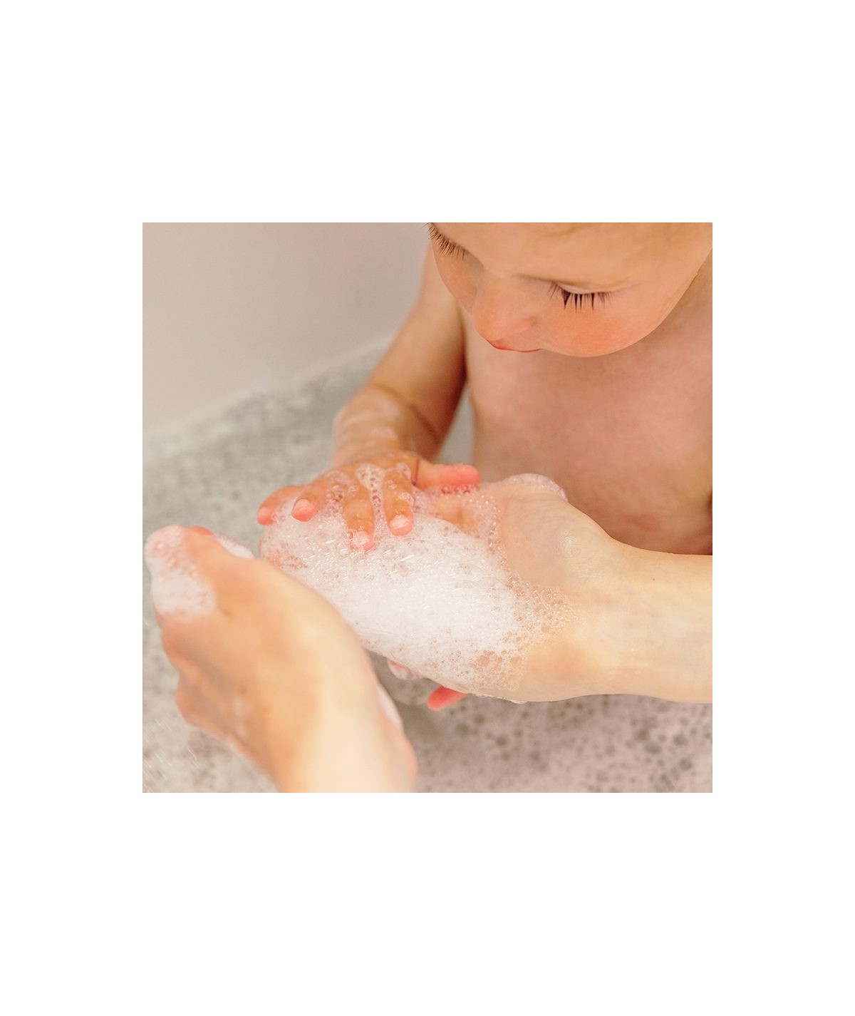 Mouiller préalablement la peau du bébé à l'aide d'un gant de toilette, masser délicatement, faire mousser et rincer soigneusement.