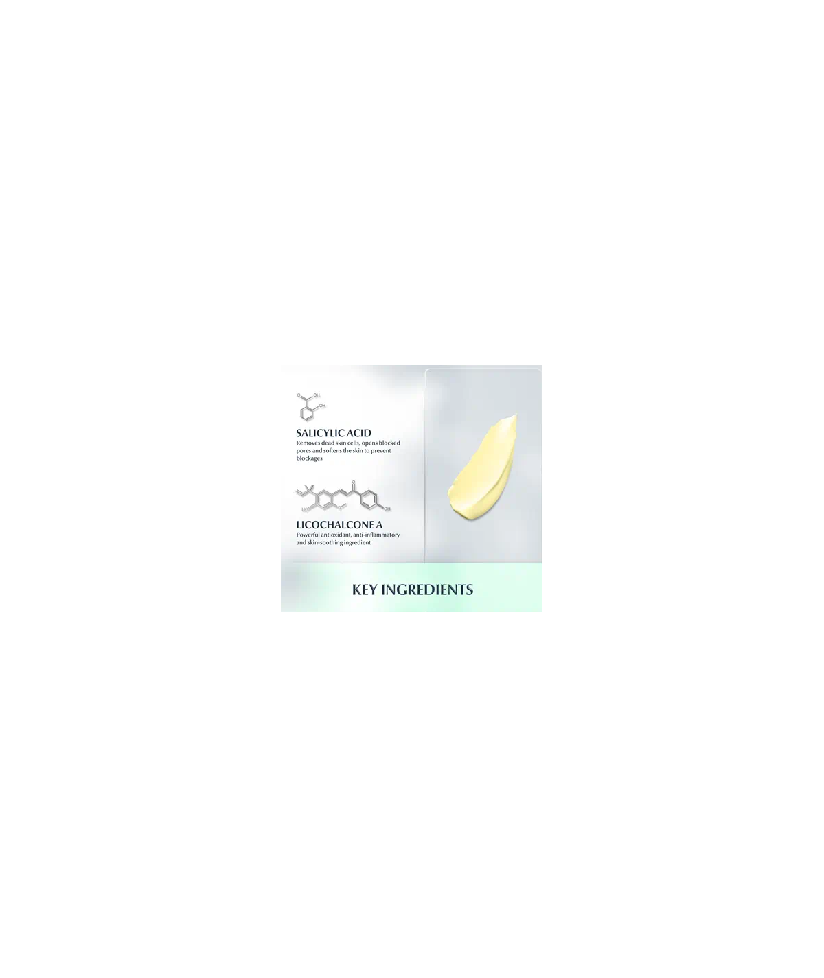 Fomrule INCI : Aqua, Glycerin, Dimethicone, Cetearyl Alcohol, Salicylic Acid, L-Carnitine, Decylene Glycol, Glycyrrhiza Inflata Root Extract, PEG-150 Distearate, Ammonium Acryloyldimethyltaurate/VP Copolymer, Sodium Stearoyl Glutamate, Sodium Acrylates/C10-30 Alkyl Acrylate Crosspolymer, Xanthan Gum, Hydroxyethylcellulose, Trisodium EDTA, Sodium Hydroxide, Sodium Chloride, Phenoxyethanol, Parfum.