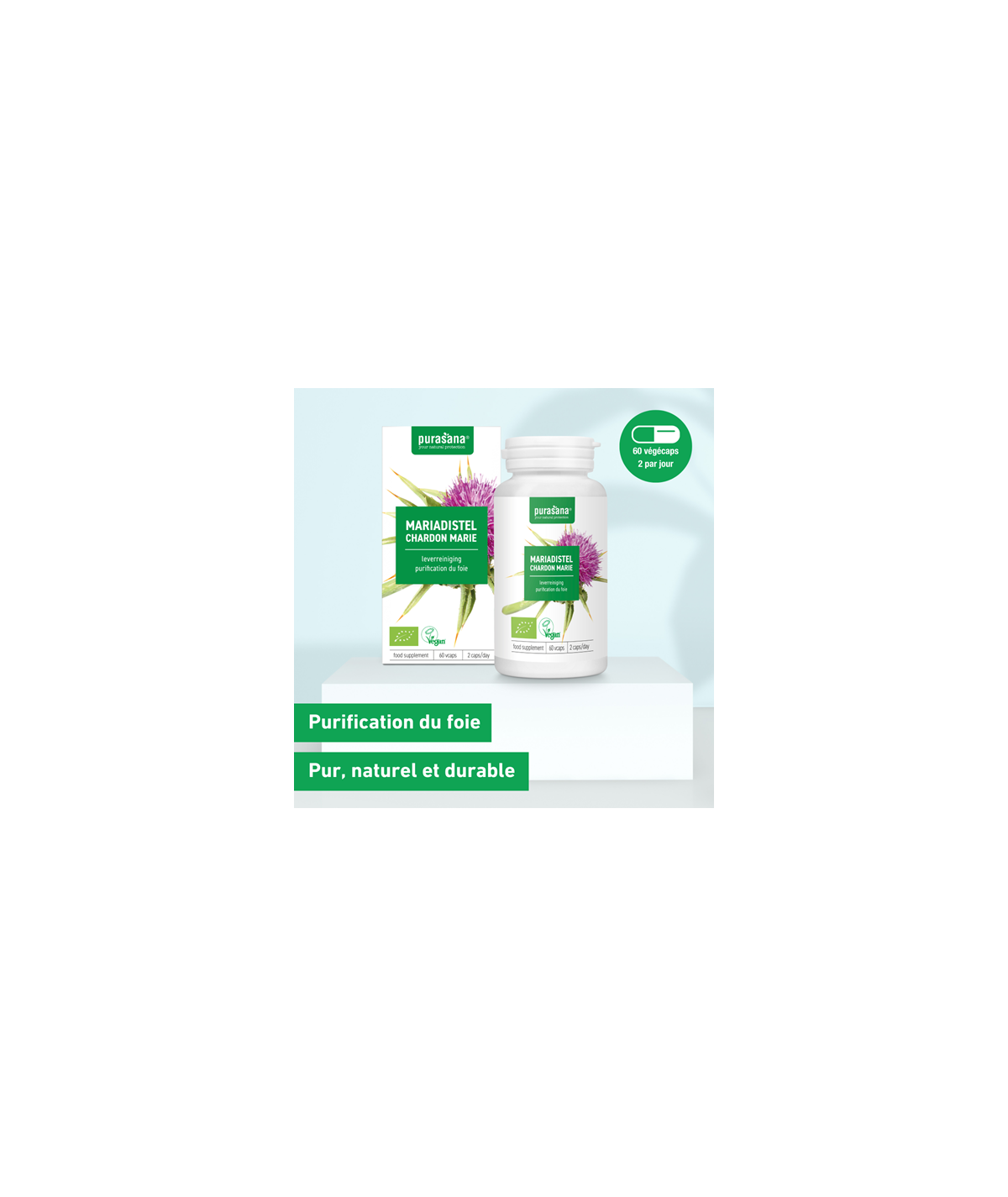 Le chardon marie aide à protéger le foie grâce à la silymarine, qui aide à son tour à maintenir la fonction hépatique. Ainsi, le chardon marie favorise la digestion et la purification du corps.