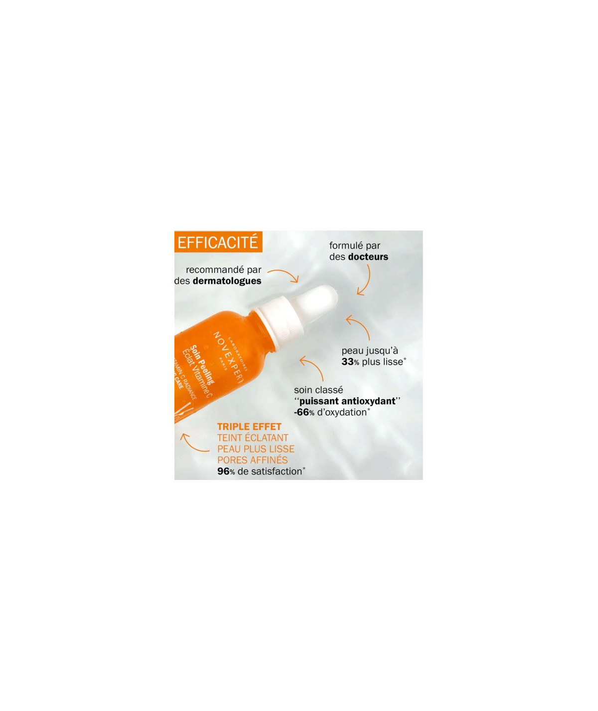 LA VITAMINE C : ANTIOXYDANTE MAIS PAS SEULEMENT. Capable de neutraliser les radicaux libres (molécules responsables de l'oxydation), la vitamine C est un PUISSANT ANTIOXYDANT. Elle protège les cellules d'un vieillissement accéléré, limite le teint terne et la création de taches. Mais ce n'est pas fini... c'est LA vitamine ANTI-AGE car sans elle, il est impossible de synthétiser les collagènes, les ressorts cutanés procurant fermeté et élasticité. Déficience en vitamine C = risque de peau lâche et creusée. LE PARADOXE VITAMINE C : INDISPENSABLE MAIS INSAISISSABLE Consensus scientifique : la Vitamine C est LA vitamine indispensable à la bonne santé de la peau. Ce n'est pas anodin si elle est 100 à 1000 fois plus concentrée que les autres vitamines au sein des couches cutanées. MAIS, en tant qu'humains nous ne sommes plus capables de la produire. Nous devons donc la trouver dans l'alimentation, et les soins cosmétiques. Ce qui n'est pas si simple à cause de sa grande instabilité ainsi que de sa pénétration limitée si elle se trouve sous forme native. PASSER OUTRE LES CONTRAINTES DE LA VITAMINE C POUR PROFITER A 100% DE SES BENEFICES Chez Novexpert, nous avons sélectionné une vitamine C 20 fois plus stable que la "conventionnelle", qui pénètre efficacement, et s’intègre dans des soins ayant un pH similaire à celui de la peau. Cela permet de proposer des soins à la Vitamine C compatible pour tous - mêmes les peaux sensibles - en toutes saisons (hors soins contenant des actifs peeling).