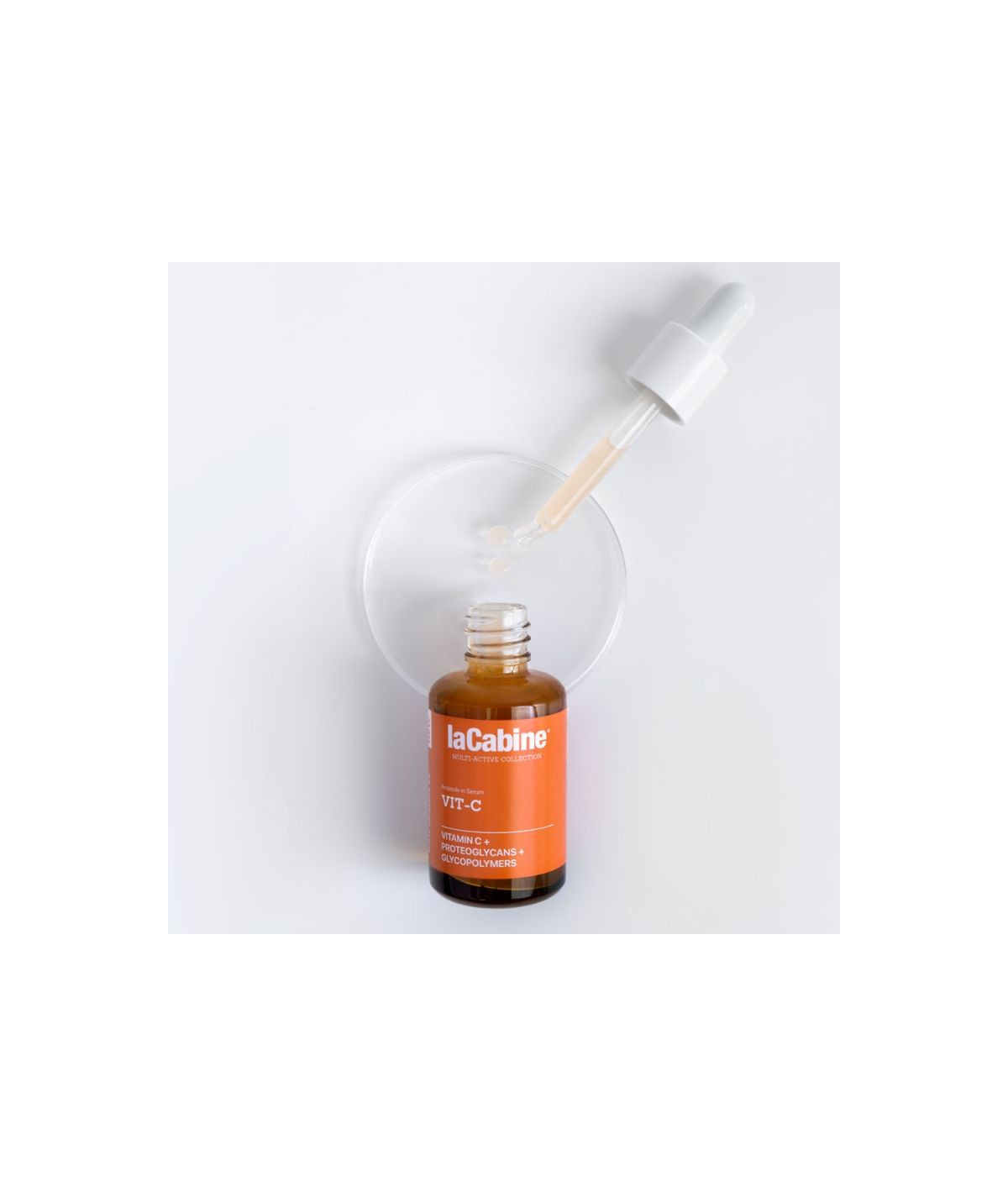LaCabine Sérum Vit-C, riche en vitamine C, hydrate et illumine la peau tout en luttant contre les signes du vieillissement. Il unifie le teint et procure un éclat naturel.