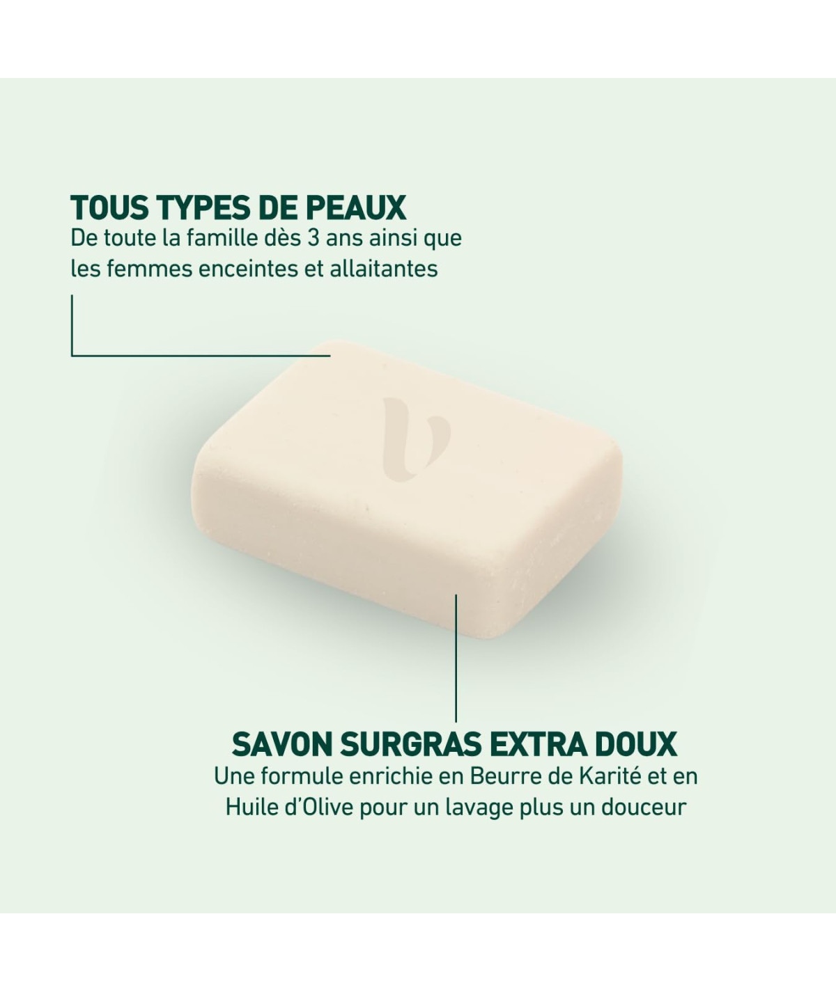 ENRICHI EN ACTIFS 100% D'ORIGINE NATURELLE : Ce savon solide est enrichi en beurre de karité et huile d'olive, deux actifs d'origine 100% naturelle aux propriétés adoucissantes. La glycérine qu'il contient optimise l'hydratation cutanée en retenant l'eau.