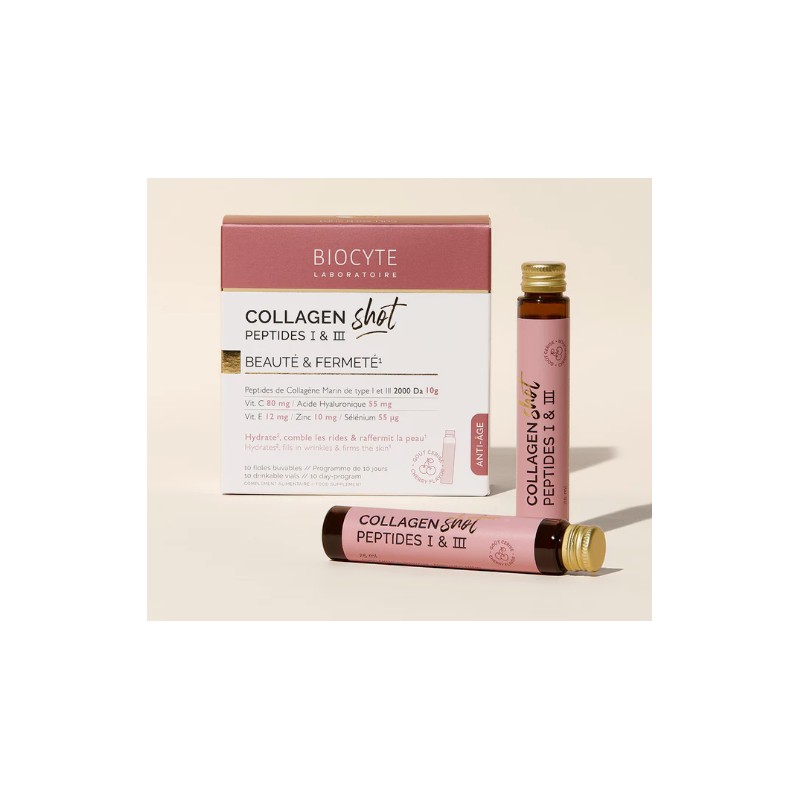 Le Collagen Shot de Biocyte est un complément alimentaire innovant, spécialement conçu pour améliorer la qualité de la peau jour après jour. Grâce à sa formule hautement concentrée en collagène marin et en acide hyaluronique, il agit en profondeur pour hydrater, redensifier et protéger la peau.