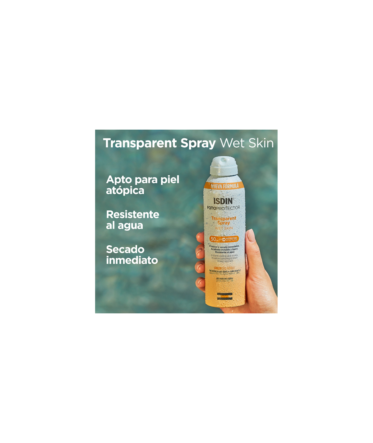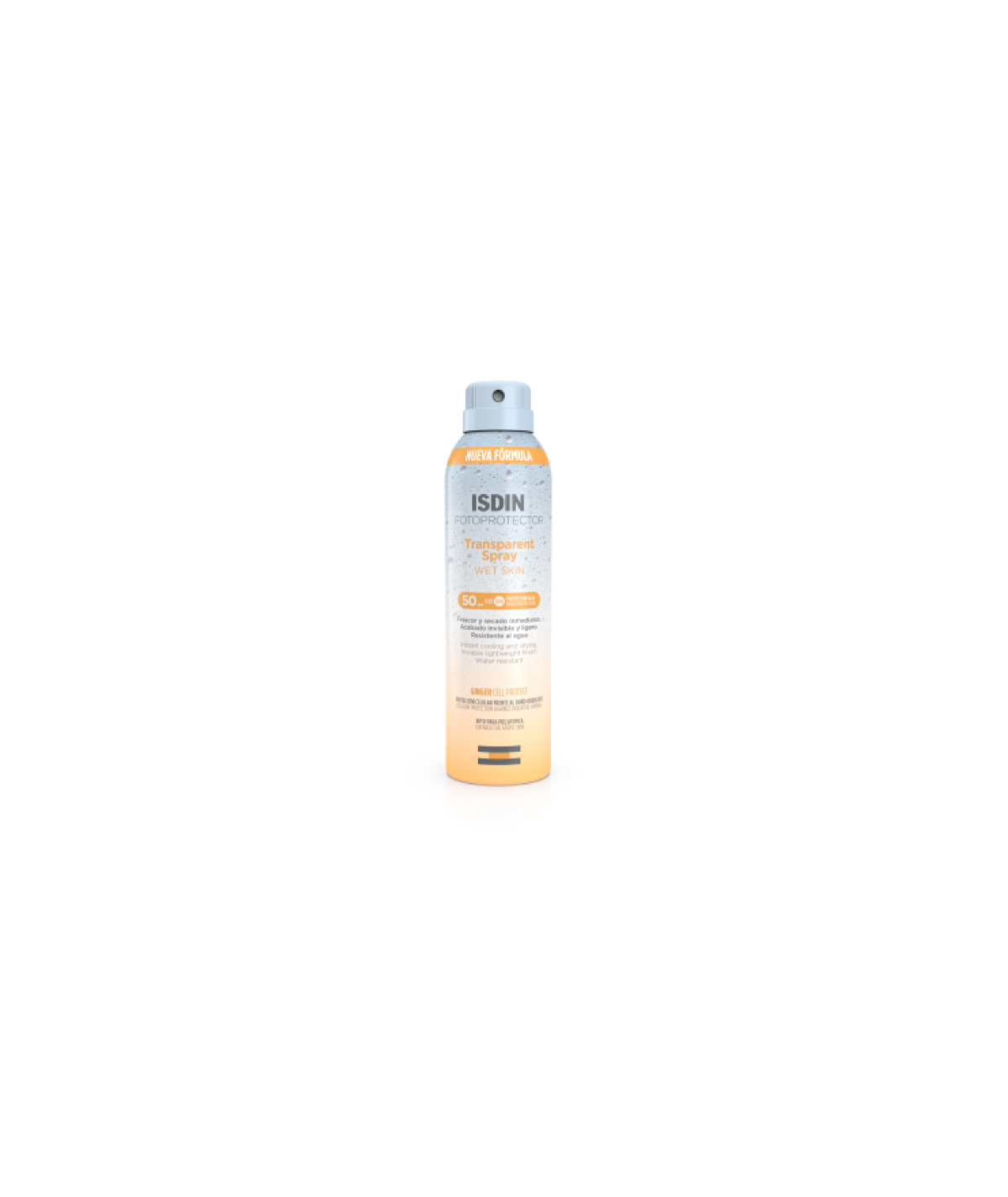 ISDIN Transparent Spray Wet Skin SPF50 250ml est un spray solaire au fini invisible qui sèche rapidement.