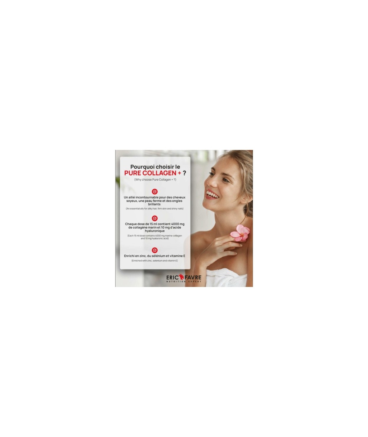 Composé de collagène marin et d’acide hyaluronique, pure collagen + rend la peau éclatante et belle.