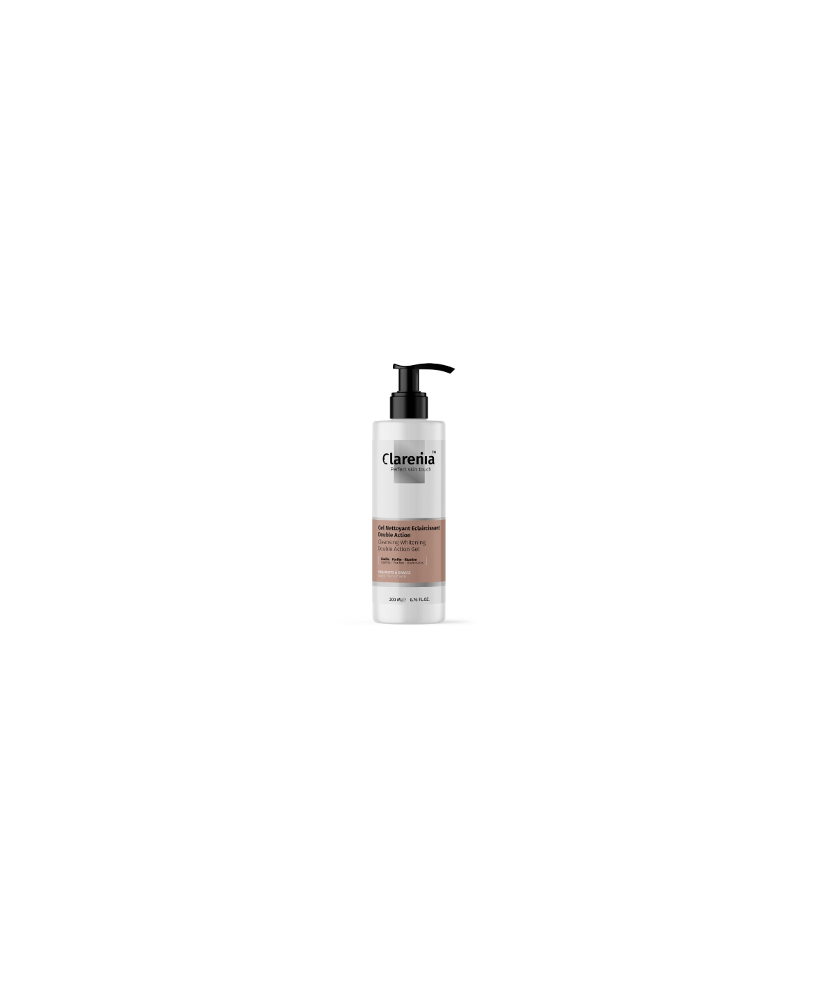 CLARENIA GEL NETTOYANT ECLAIRCISSANT DOUBLE ACTION PMG élimine les impuretés et l'excès de sébum et corrige les troubles de pigmentation.