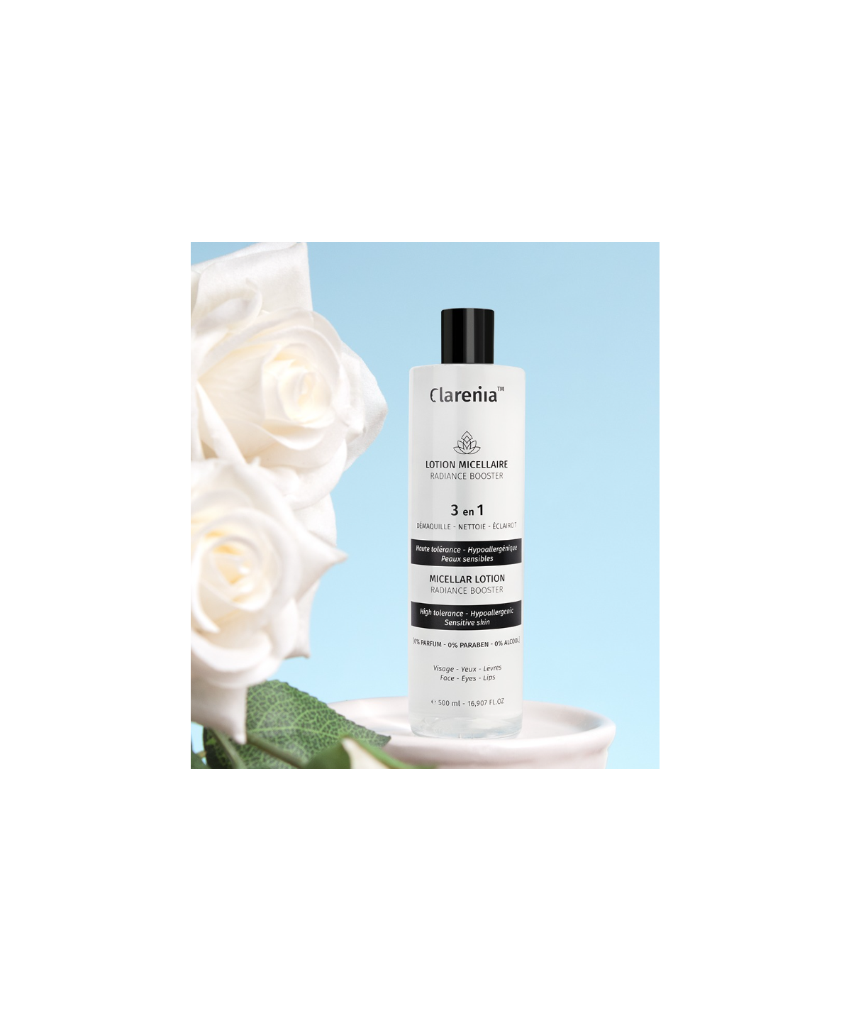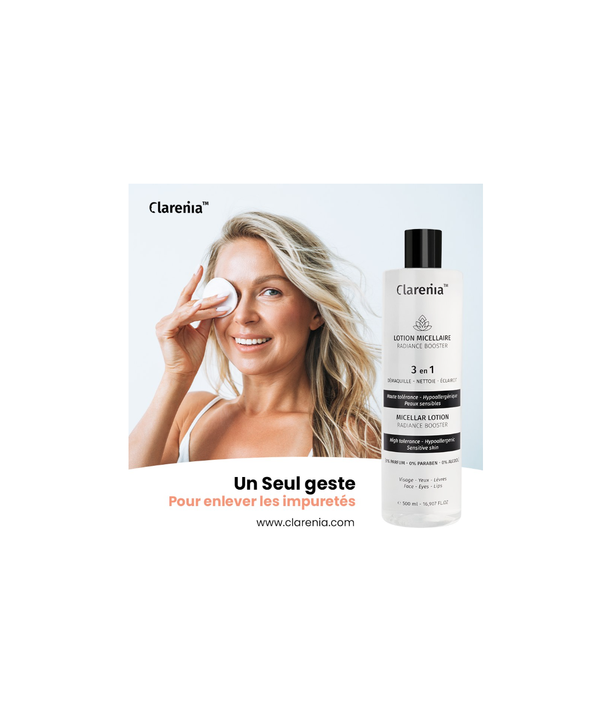 Lotion micellaire spécialement conçue pour les peaux sensibles et ternes, l'eau micellaire de Clarenia nettoie, démaquille et éclaircit le visage tout en douceur. Sa formule permet en effet d'éliminer les impuretés tout en respectant l'équilibre de la peau.